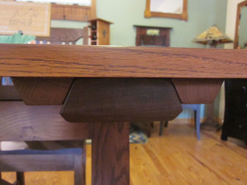 Comfortably seat 10 at this 39 x 96 harvest table. Impeccably crafted with curved, mortise & tenon trestle and floating dovetail top. Massive tapered legs. Shown in quarter-sawn white oak with Michaels Cherry stain. Satin finish is a durable, easy-care, water-resistant, and stain resistant varnish